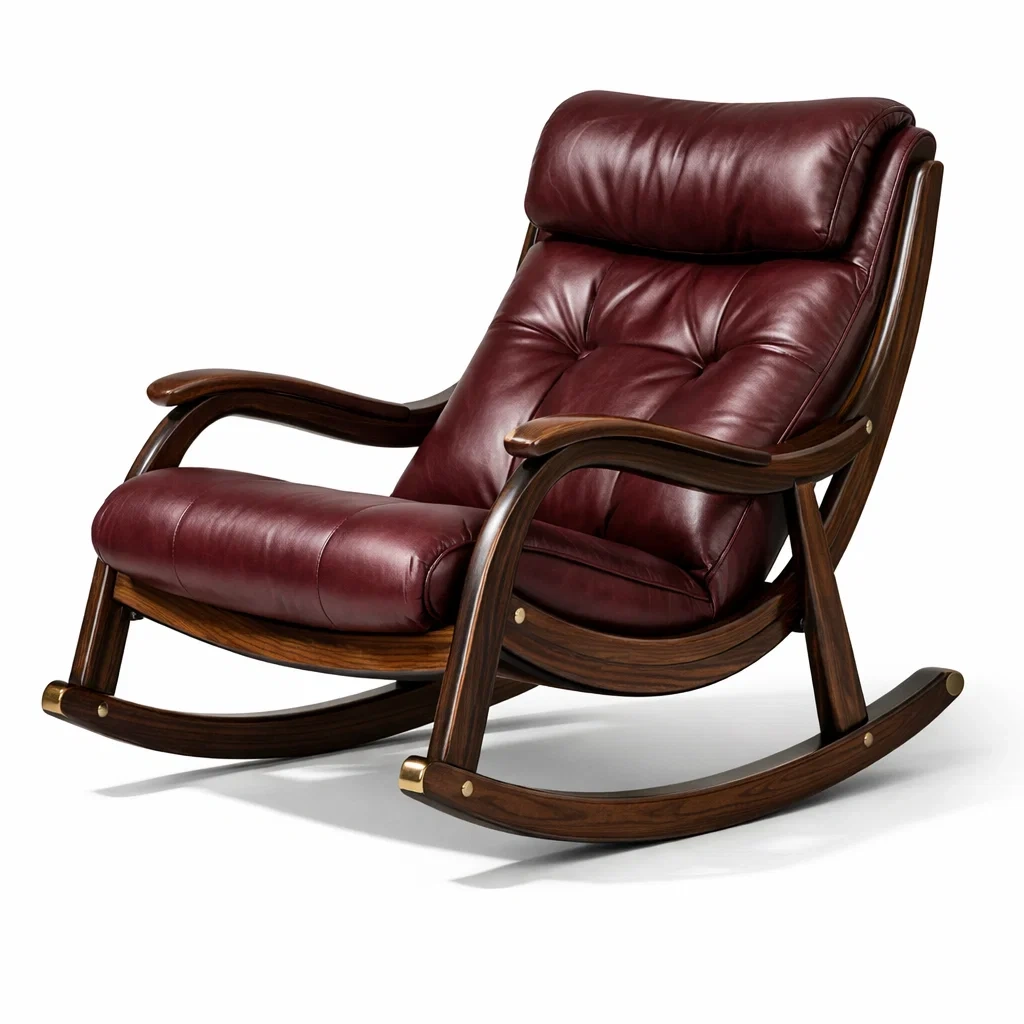 Ce fauteuil à bascule est conçu avec du cuir synthétique pour le revêtement, offrant une assise confortable. La structure est en bois massif, assurant robustesse et durabilité. Dimensions: longueur 90 cm, largeur 80 cm, hauteur 100 cm. Poids maximal supporté: 120 kg.